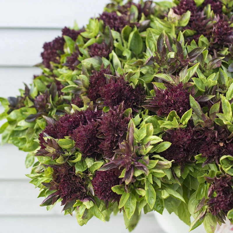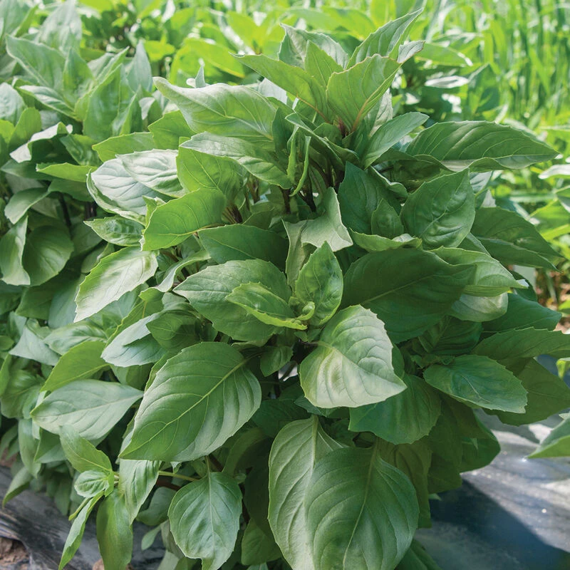 Edible ornamental with showy flowers. Very uniform, upright habit. Flat, 2–3″ long leaves that are larger than typical Thai types; purple stems and dark, purple-red flower bracts. Cinnamon/clove flavor with hints of anise. Slower growing and slow to bolt; needs a long, warm season for cut-flower use. Ht. 14–20″. USDA Certified Organic.