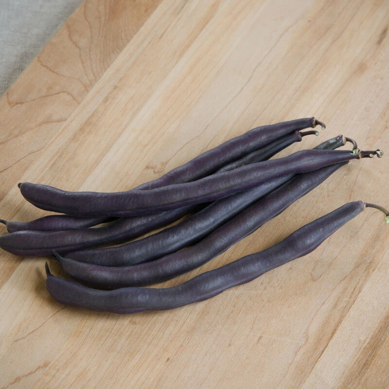 The brilliant purple, 5–5 1/2″ pods are eye-catching at market, easy to spot when harvesting, and add stunning color to salads when used raw. The pods do turn green when cooked. Upright plants are dark green with a purple tinge. Buff-colored seeds. Bush bean. USDA Certified Organic.