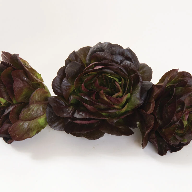 Triple red heads have a round base with open leaves. Attractive red to green color transition. Delicate, buttery flavor. Great for selling as a whole head or in salad mix. Pair with either a red, cored-type oak or red, cored-type butter. Very good bolt tolerance. MT0-30. Pelleted seed.