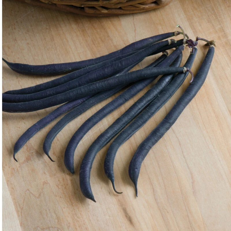 “Extra-fine” grade beans are 4–5″ long with straight, slender, bright purple pods. Turns green upon cooking. Medium-size upright plants yield well. Small, light brown seeds. Bush bean.